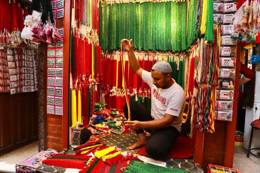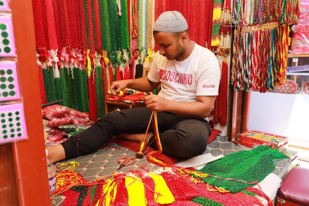 इन्द्रचोकमा सजीब उद्दिनको पसल साना–साना रंगीन सिसाका दानाले भरिएको छ। पोते, चुरा, हरियो–रातो रंग र त्यो रंगभित्र मिसिएको सिप, अनुभव र धर्मको सह-अस्तित्व। “हाम्रो बाजेको पसल हो यो । बाजेले ६०–७० वर्षसम्म यही काम गर्नुभयो। उहाँबाट नै मैले सिकेको,” उनी भन्छन् ।