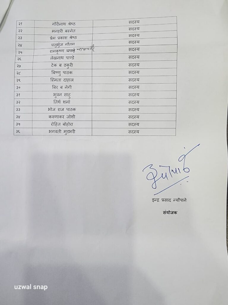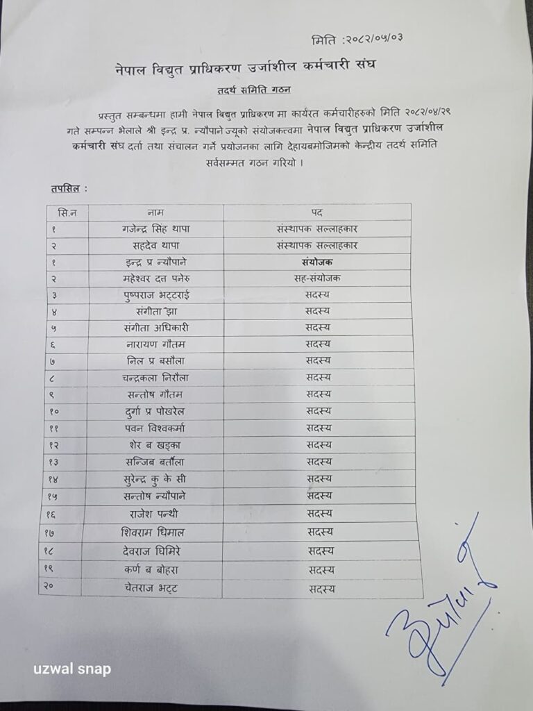 विद्युत प्राधिकरणमा कार्यरत कर्मचारीहरुको साउन २९ गते बसेको भेलाले इन्द्र प्रसाद न्यौपानेको संयोजकत्वमा नेपाल विद्युत प्राधिकरण ऊर्जाशील कर्मचारी संघ दर्ता तथा सञ्चालन गर्ने प्रयोजनका लागि सर्वसम्मतले ३६ जनाको कमिटी बनेको छ । जसमा दुई जना थप संस्थापक सल्लाहकार समिति छ ।