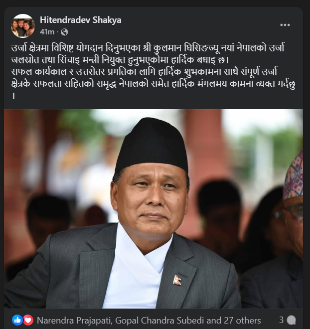 उनले सामाजिक सञ्जाल फेसबुकबाटै बधाई दिएका हुन् । हितेन्द्र देव शाक्य कुलमान घिसिङको पदबहालीमा उपस्थिति नभएको भन्दै चौतर्फी चासो भइरहेको थियो । उनी विदेशमा रहेका कारण उपस्थित हुन सकेका थिएनन् । बिहिबार उनी नेपाल फर्कने कार्यक्रम छ । बिहिबार नै उनले फेसबुकमा बधाई दिएका हुन् ।