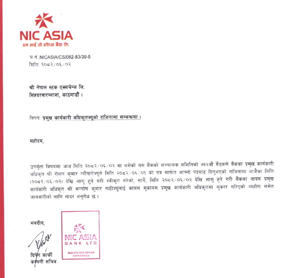 एनआईसी एसियाले नेपाल स्टक एक्सचेन्ज लिमिटेडलाई प्रमुख कार्यकारी अधिकृतले राजीनामा दिएको बारेमा जानकारी गराएको छ ।