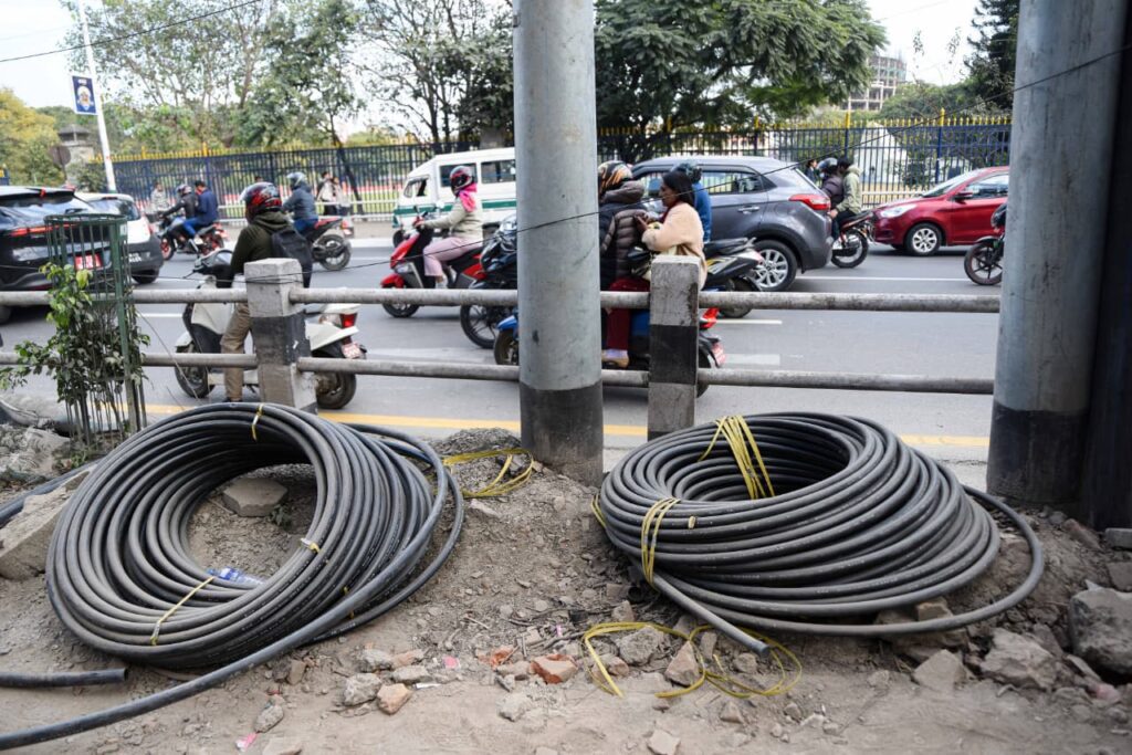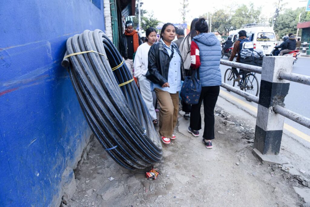 फुटपाथ बनाउने भन्दै सामग्रीहरू राखिएको भए पनि काम नबढ्दा पैदल यात्रुले सघन यातायातसँगै जोखिम मोलेर हिँड्न बाध्य छन्।