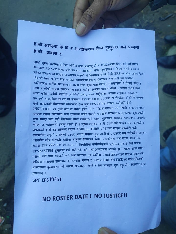 काठमाडौ । रोजगारीका लागि कोरिया जान पाउनुपर्ने माग राखेर युवाहरु आन्दोलनमा उत्रिएका छन् । उनीहरु नौ बुँदे माग राखेर ग्वार्कोस्थित इपीएस कोरिया शाखा अगाडि प्रदर्शन गरेका हुन् ।तस्बिरहरू : सफल प्रकाश श्रेष्ठ / नेपाल फोटो लाइब्रेरी