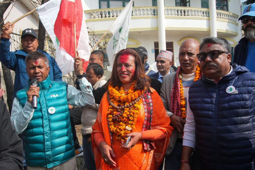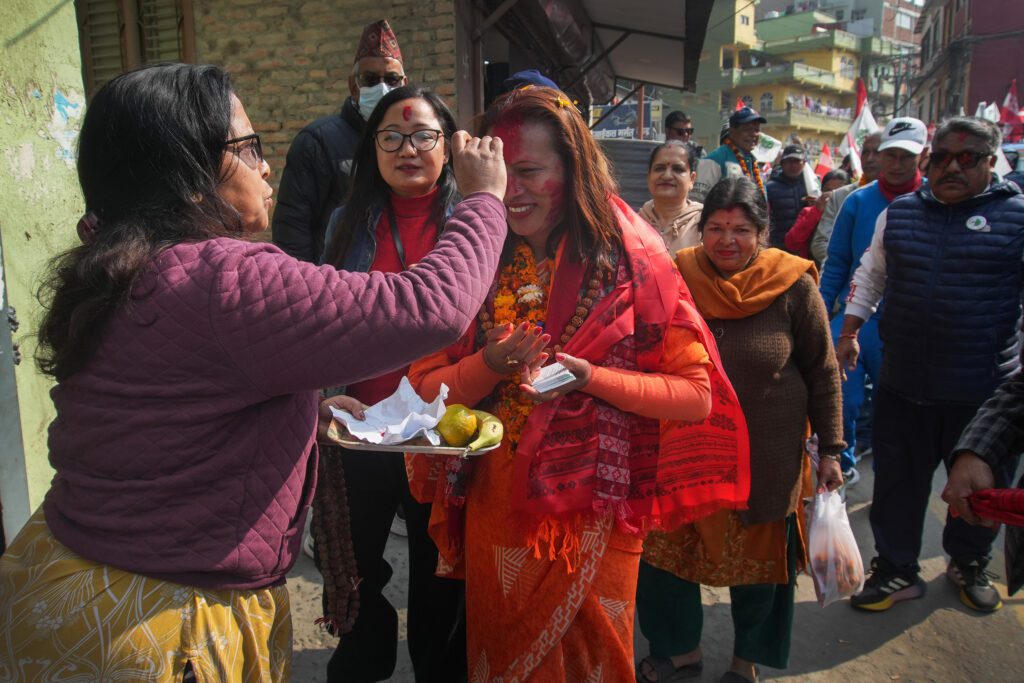Nanu Bastola ,Candidate of Nepali congress-9, during the door to door campaign for upcoming Federal election at Kalanki on thursday. Photo: Prakash Chandra Timilsena/Nepal Photo Library